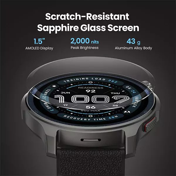 • Vibrant 1.5″ HD AMOLED Display (2,000 nits): Enjoy a stunningly clear and bright screen with a resolution and 2,000 nits peak brightness, ensuring excellent visibility and vibrant colors in any lighting condition. The screen is protected by a scratch-resistant sapphire crystal glass.