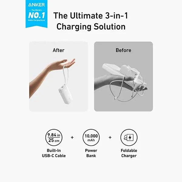 The Anker 30W Fusion is a versatile 3-in-1 device that combines a 10,000mAh power bank, a high-speed wall charger, and a built-in USB-C cable. With foldable prongs and two-way fast charging, it powers your devices and recharges itself simultaneously. The 30W output can charge an iPhone 15 Pro to 50% in just 25 minutes. A built-in USB-C cable and extra USB-C port let you charge two devices at once. The digital display shows real-time battery percentage, and its compact design makes it perfect for travel or everyday use.