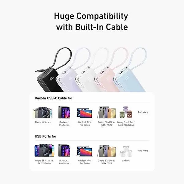 • Features: 3-in-1 design (Power Bank + Wall Charger + Built-in Cable), LED display,