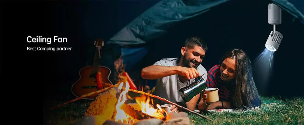 - Ceiling fan with built-in hanging loop for tents, cars, or trees