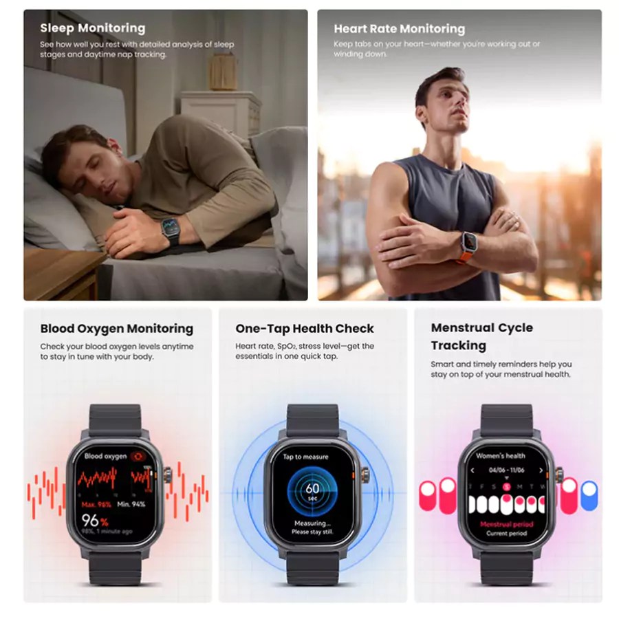 - Comprehensive 24/7 Health Monitoring: Tracks heart rate (with high/low alerts), continuous SpO₂ (blood oxygen) with alerts, detailed sleep stages (Light, Deep, REM), stress levels, emotion tracking, and menstrual cycle prediction. One-tap measurement for key metrics.