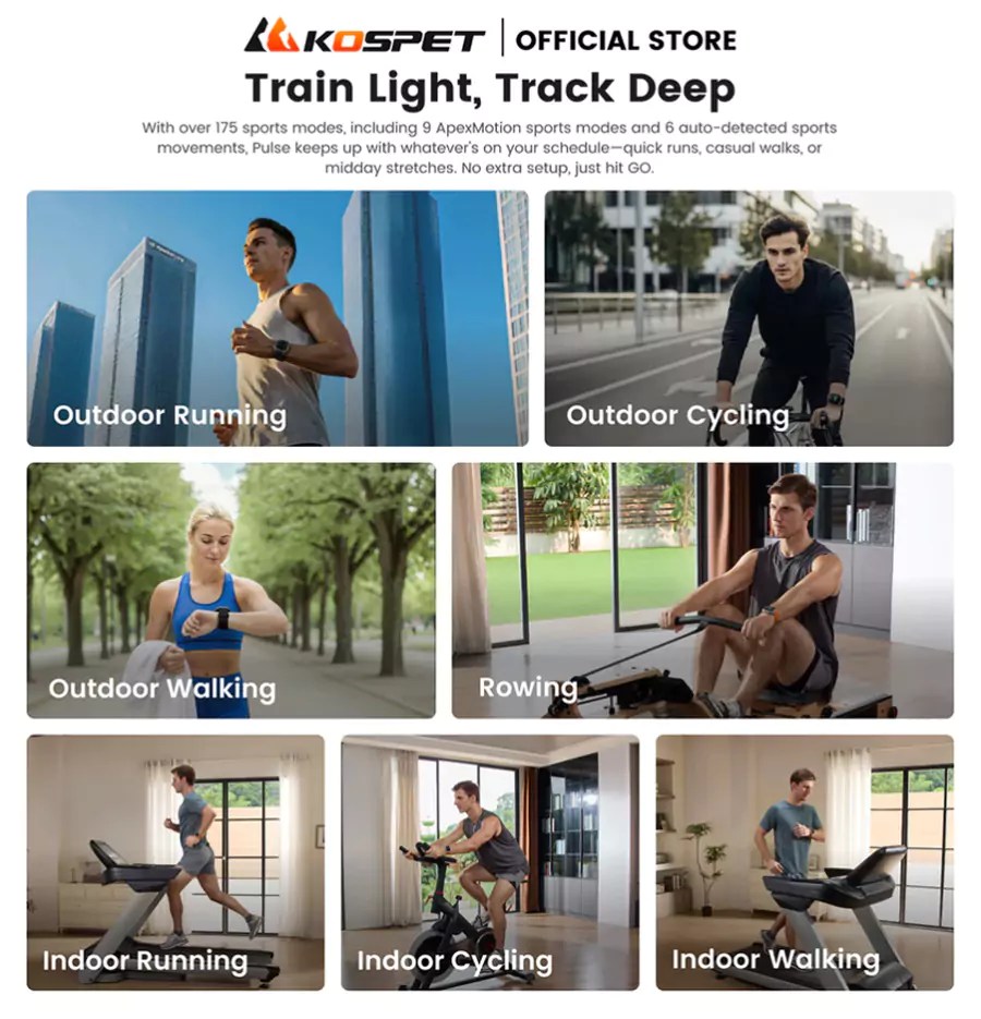 - 180+ Sports Modes & Auto-Detection: Supports a vast range of activities, including 8 core modes and 180+ extended modes via the ApexMove app. Automatically detects 6 common activities (walking, running, cycling, rowing, elliptical, idle)