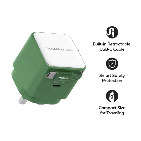 Charge Smarter, Travel Lighter: Momax 1-Charge+ 35W GaN Charger with Retractable Cable (US Plug) – All-in-One Powerhouse for Your Devices!