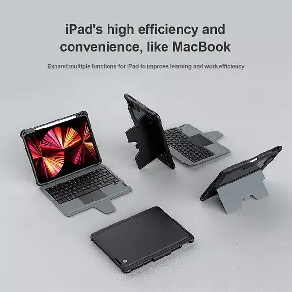 Bumper Combo Keyboard Case is a multi-function keyboard case specially for iPad Pro and iPad Air, featuring an adjustable stand, a removable keyboard and a trackpad that make it convenient to type, view, read and sketch. Also let you enjoy a flexible operation experience. The adopted military-grade anti-fall case wraps tightly around iPad ‘s edges, offering all around protection. Patented sliding camera cover design efficiently protect iPad’s camera from abrasion and scratches. Concise and delicate PU fabric blends with the aesthetics of iPad, a perfect integration of art and technology.