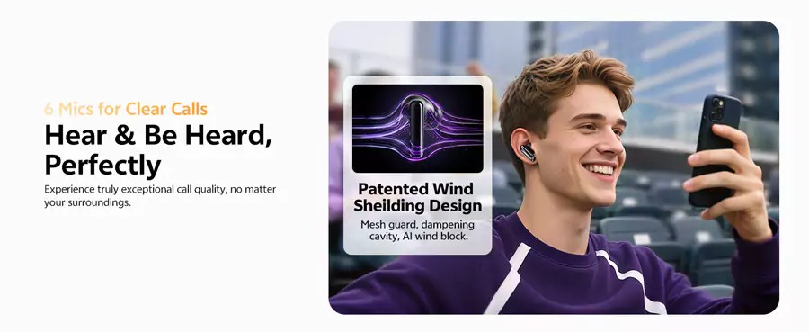 • 6-Mic AI Clear Calls: Three microphones per earbud with AI noise cancellation and a wind-resistant algorithm ensure crystal-clear conversations.